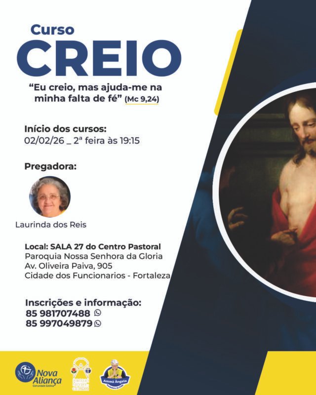 Em 2026, a Comunidade Católica Nova Aliança – Missão Nossa Senhora da Glória, em Fortaleza, dá continuidade à sua missão evangelizadora e abre inscrições para novas turmas dos cursos “Querigma” e “Creio”.