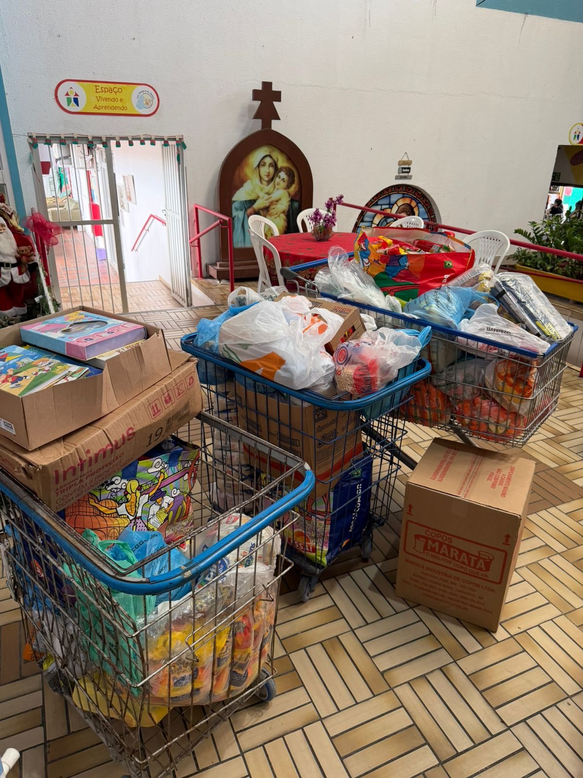 No dia 22 de dezembro de 2025, os grupos Scito Vias Domini e Atos 9, vinculados à Paróquia Nossa Senhora da Glória, estiveram no Lar Amigos de Jesus para a entrega das doações arrecadadas durante a campanha de Natal.
